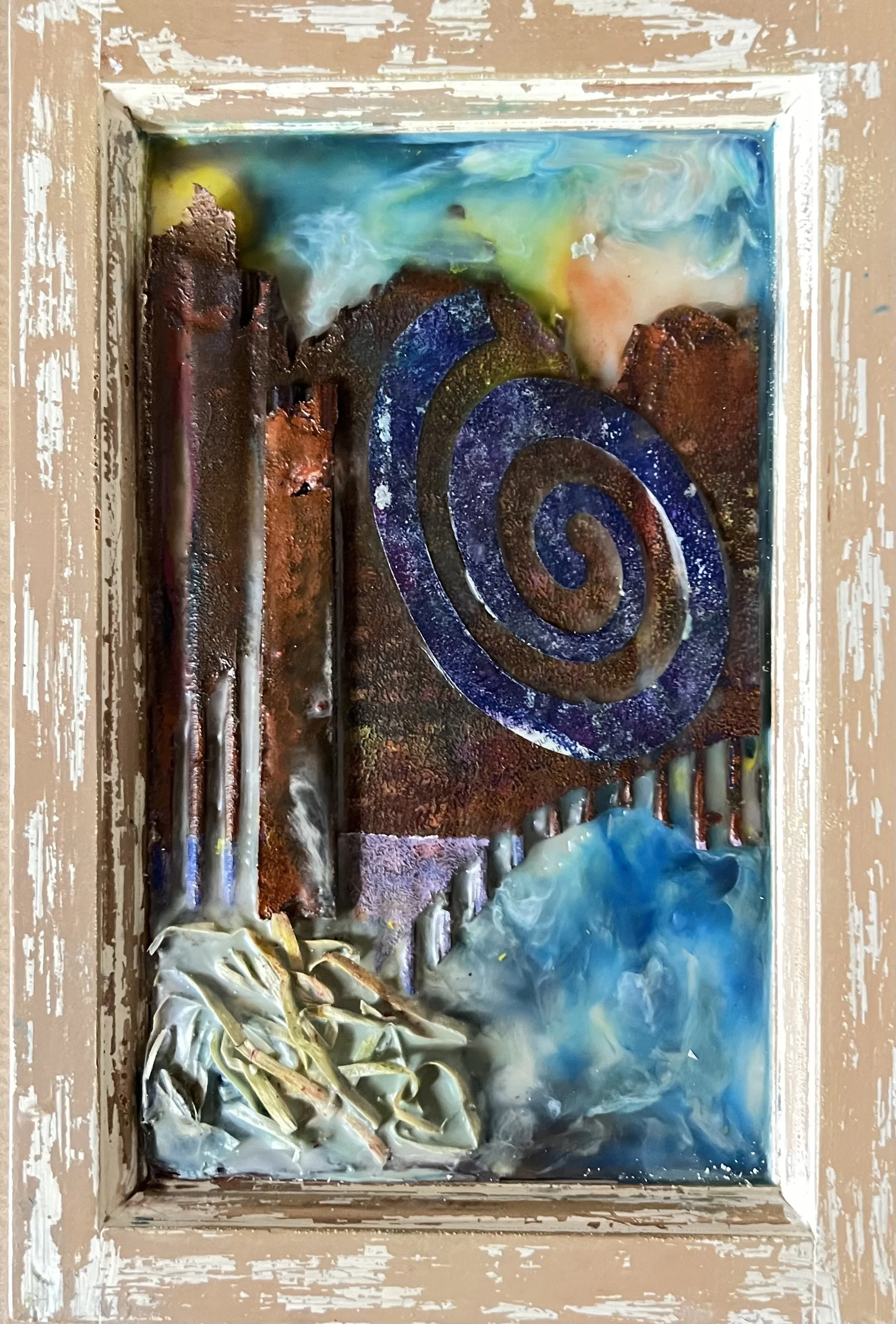 2023 / Encaustic Collage / 12H x 8W x 1.25D inches / Available / Framed