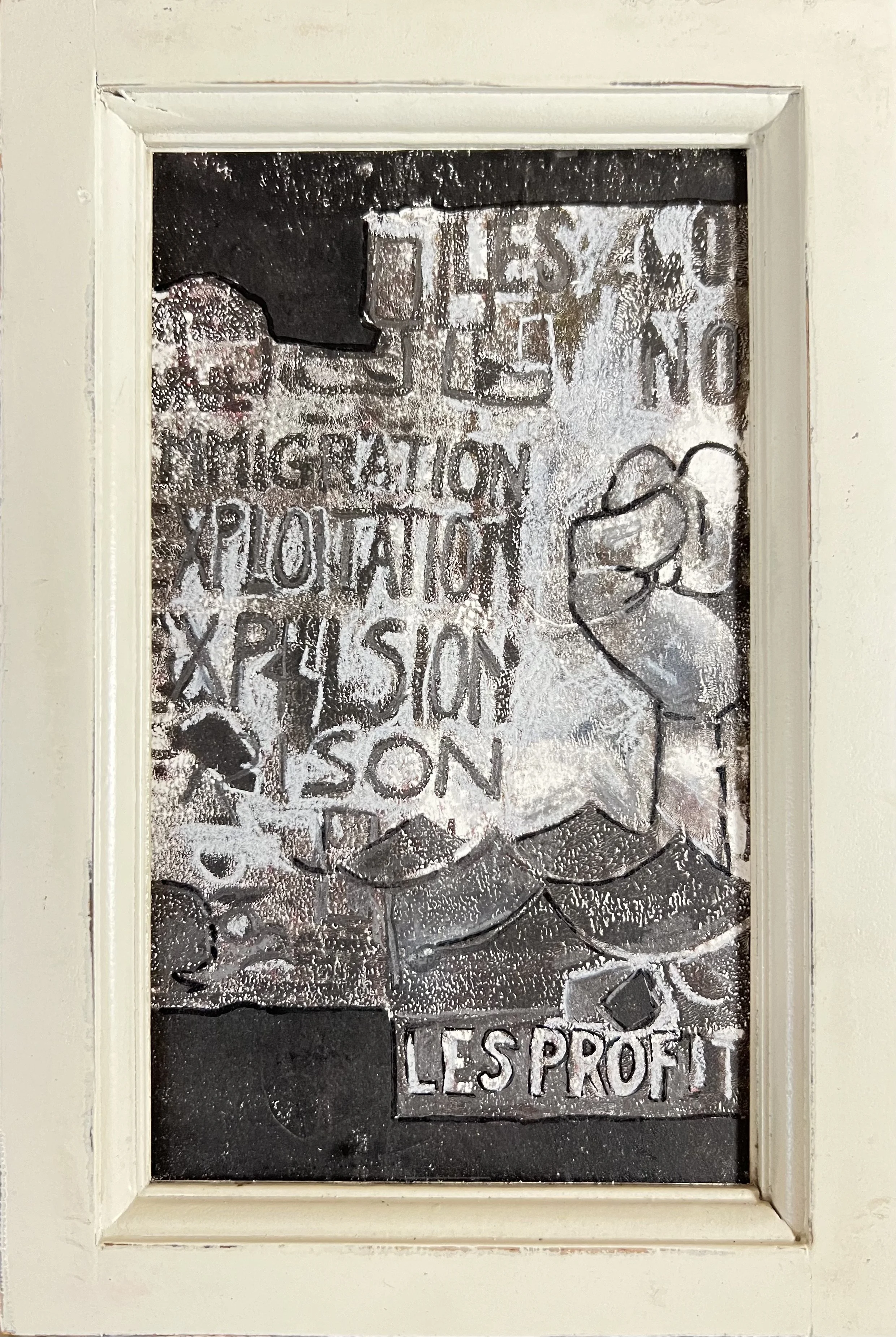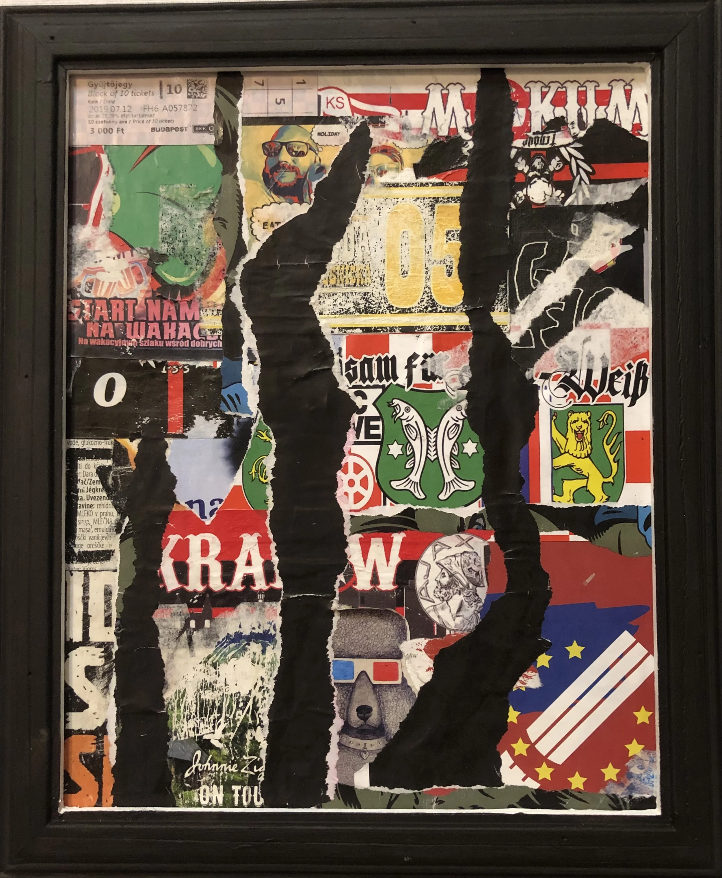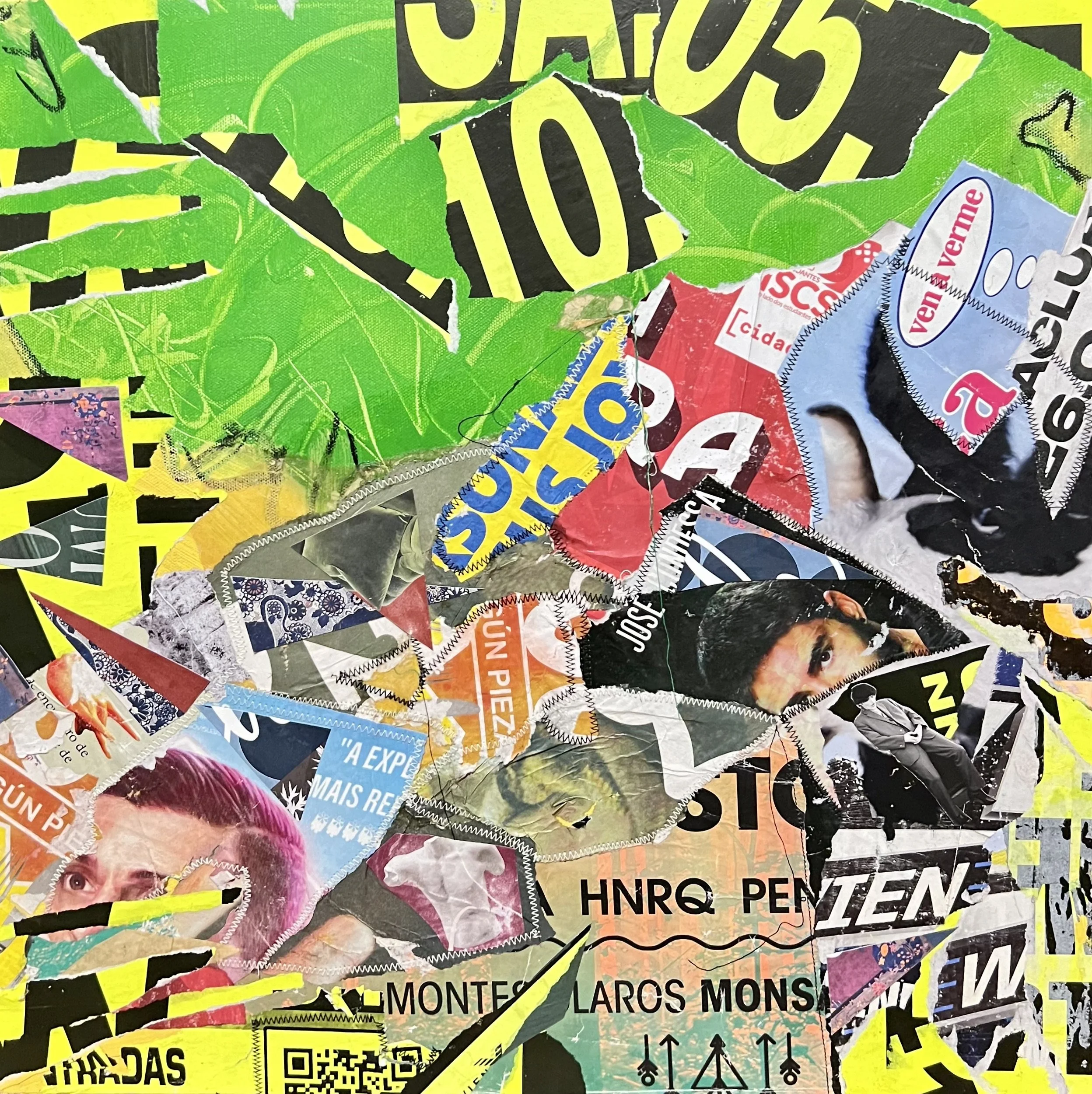 Since 2021, my collection of mixed media small works has thrived, creating over 100 works! The 12”x 8” size allows for experimentation with mediums like gel print, encaustic, and sewing. They intricately combine street posters and found objects, offering a visual narrative of urban life. Some even blur the lines between frame and picture, creating a unique visual narrative.