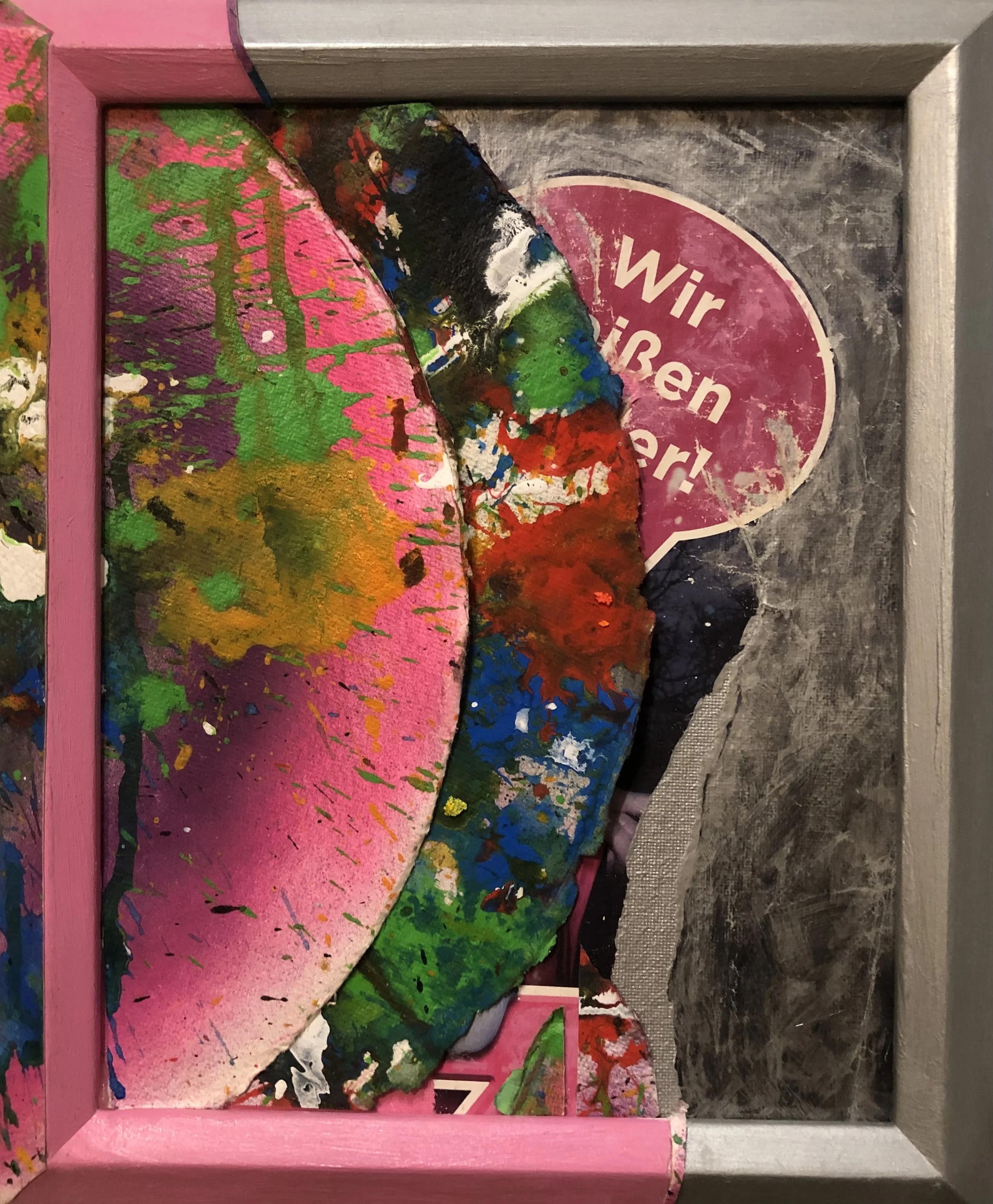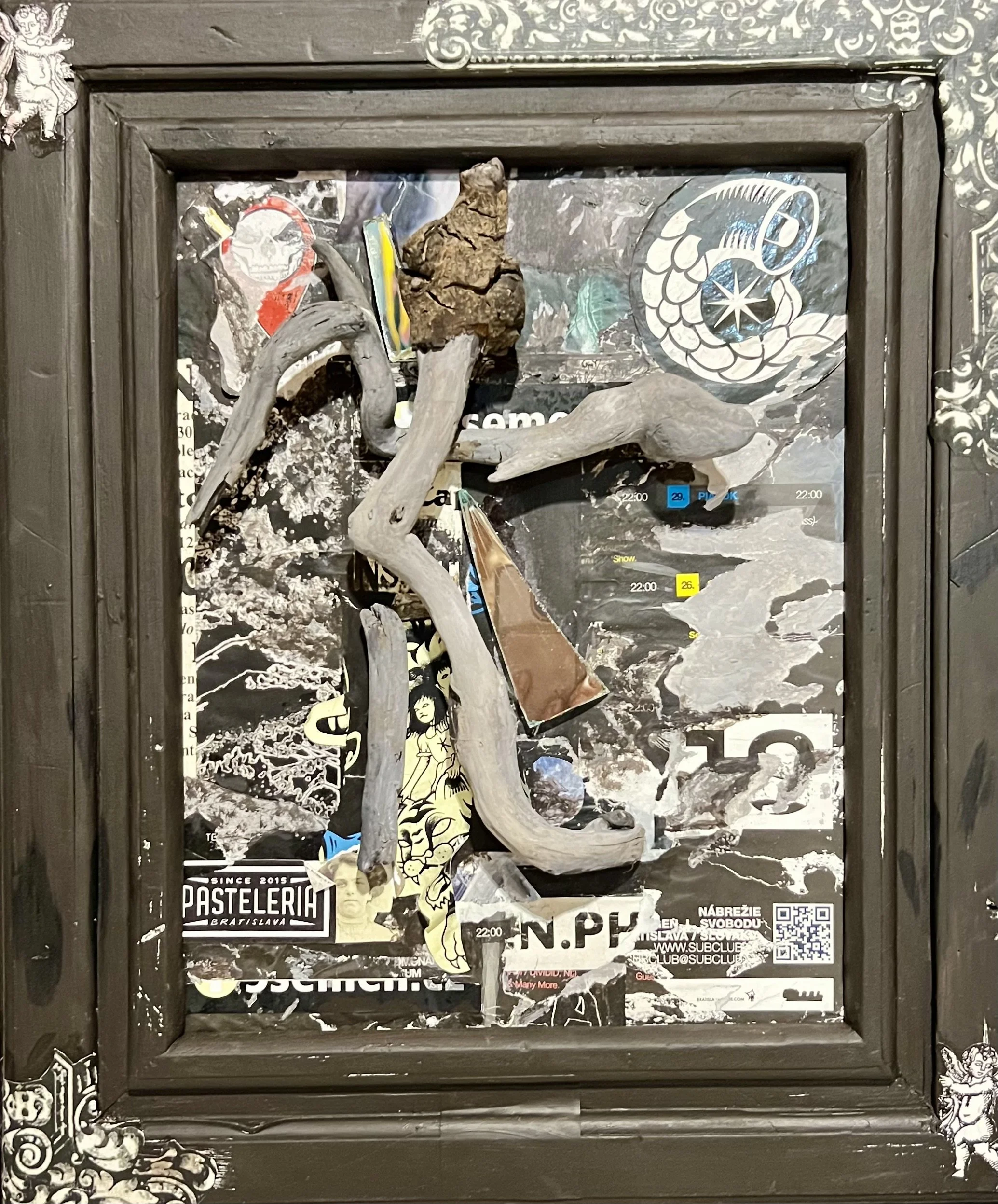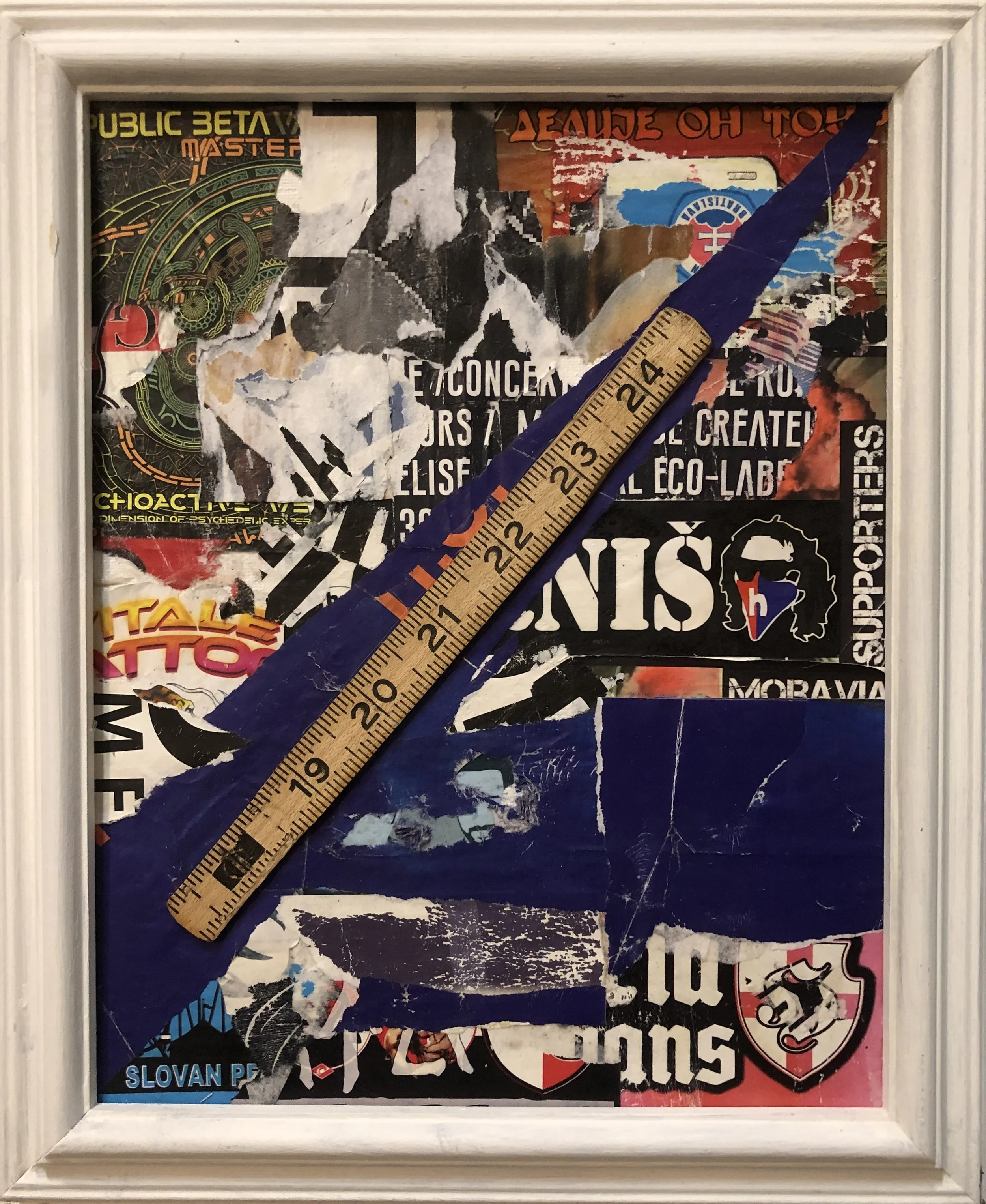Since 2021, my collection of mixed media small works has thrived, creating over 100 works! The 12”x 8” size allows for experimentation with mediums like gel print, encaustic, and sewing. They intricately combine street posters and found objects, offering a visual narrative of urban life. Some even blur the lines between frame and picture, creating a unique visual narrative.